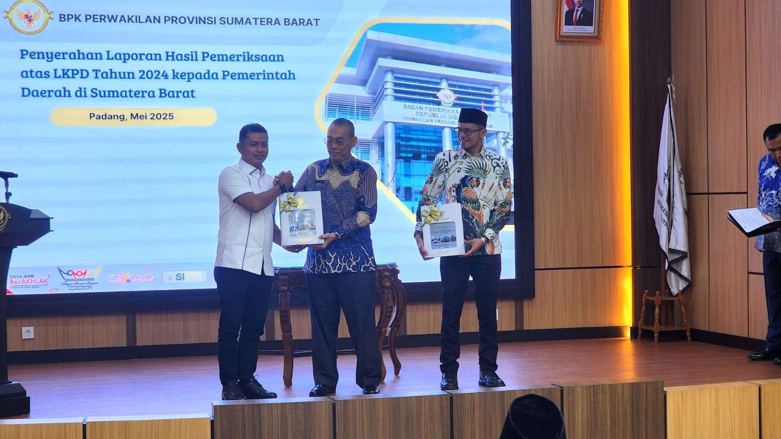 Kabupaten Solok, Denbagus.co-Pemerintah Kabupaten Solok kembali menerima predikat penilaian Wajar Tanpa Pengecualian (WTP) atas hasil pemeriksaan Laporan Keuangan Pemerintah Daerah (LKPD). Sertifikat predikat WTP tersebut diserahkan langsung oleh Kepala Badan Pemeriksa Keuangan (BPK) RI, Perwakilan Sumatera Barat, Sudarminto Eko Putra S.E., M.M., CARA., CFrA, dan diterima langsung oleh Bupati Solok, Jon Firman Pandu. S.H di Kantor BPK Ri perwakilan Sumatera Barat, Kamis (22/05/2025).