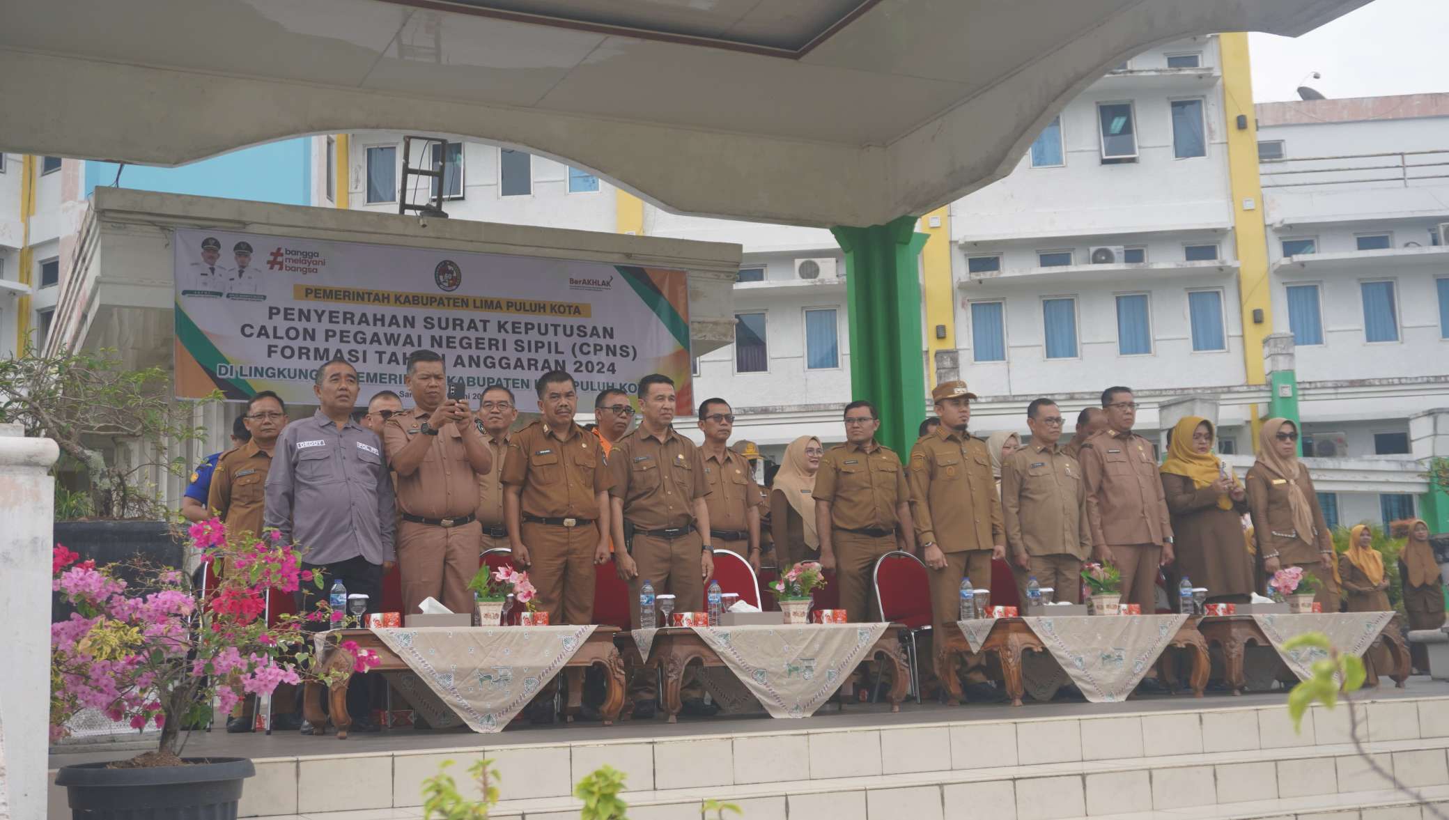 Penyerahan dilakukan langsung oleh Bupati Lima Puluh Kota, H. Safni, yang menyampaikan pesan penuh motivasi kepada para CPNS terpilih, yang terdiri dari 191 tenaga teknis dan 68 tenaga kesehatan.