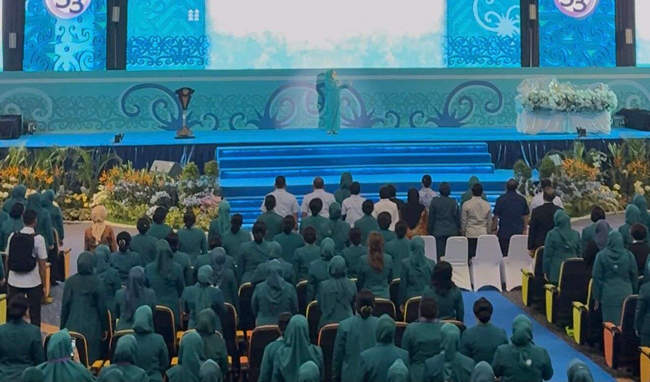 Samarinda, Denbagus.co-Ketua Tim Penggerak Pemberdayaan dan Kesejahteraan Keluarga (TP-PKK) Kabupaten Solok, Ny. Nia Jon Firman Pandu bersama Sekretaris TP PKK Sri Herlina, menghadiri Rapat Kerja Nasional (Rakernas) X PKK dan puncak peringatan Hari Kesatuan Gerak (HKG) PKK ke- 53, yang digelar di Plenary Hall Convention Center Sempaja Samarinda, Kalimantan Timur, pada Selasa (08/07/2025).