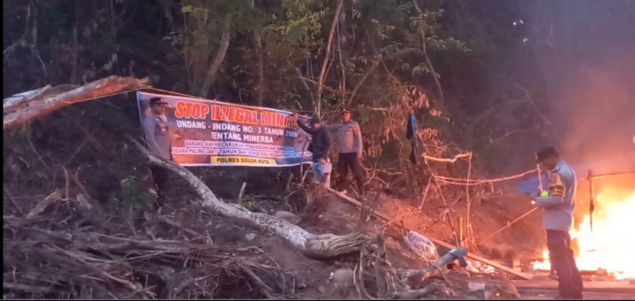 Selanjutnya, terhadap tenda-tenda dan sisa peralatan penambangan lainnya yang tersisa dilokasi , tim dari personil Polres Polres Solok Kota melakukan pemusnahan dengan cara dibakar, dan dilokasi tersebut dipasang spanduk larangan untuk melakukan tambang emas ilegal.